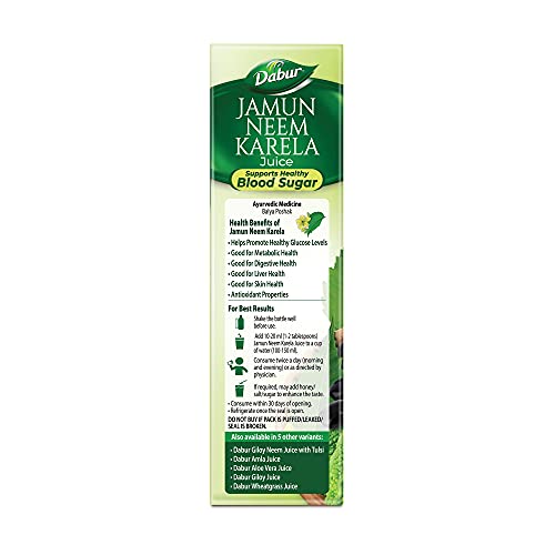 Dabur Jamun Neem Karela Juice combines the health benefits of Jamun and Karela Fruits with Neem leaves to help keep up healthy levels of blood sugar. It is an immunity booster which helps promote healthy glucose levels. It not just helps boost the metabolism but also aids for a healthy weight and is good for your digestive system. It also has antioxidant properties helps stimulate immune functions and aids in digestion. It is good for liver & skin health too. It is 100% Ayurvedic Pure Natural & Safe free from Synthetic Colours and flavours. Dabur Jamun Neem Karela Juice is part of Daburâs Ayurvedic Health Juices range with other variants being Dabur Amla Juice Dabur Giloy Juice Dabur Aloe Vera Juice and Dabur Giloy Neem Tulsi Juice. All of these variants with their key Ayurvedic ingredients are excellent immunity boosters 100% Ayurvedic free from synthetic flavour & colour completely Pure Natural & Safe.