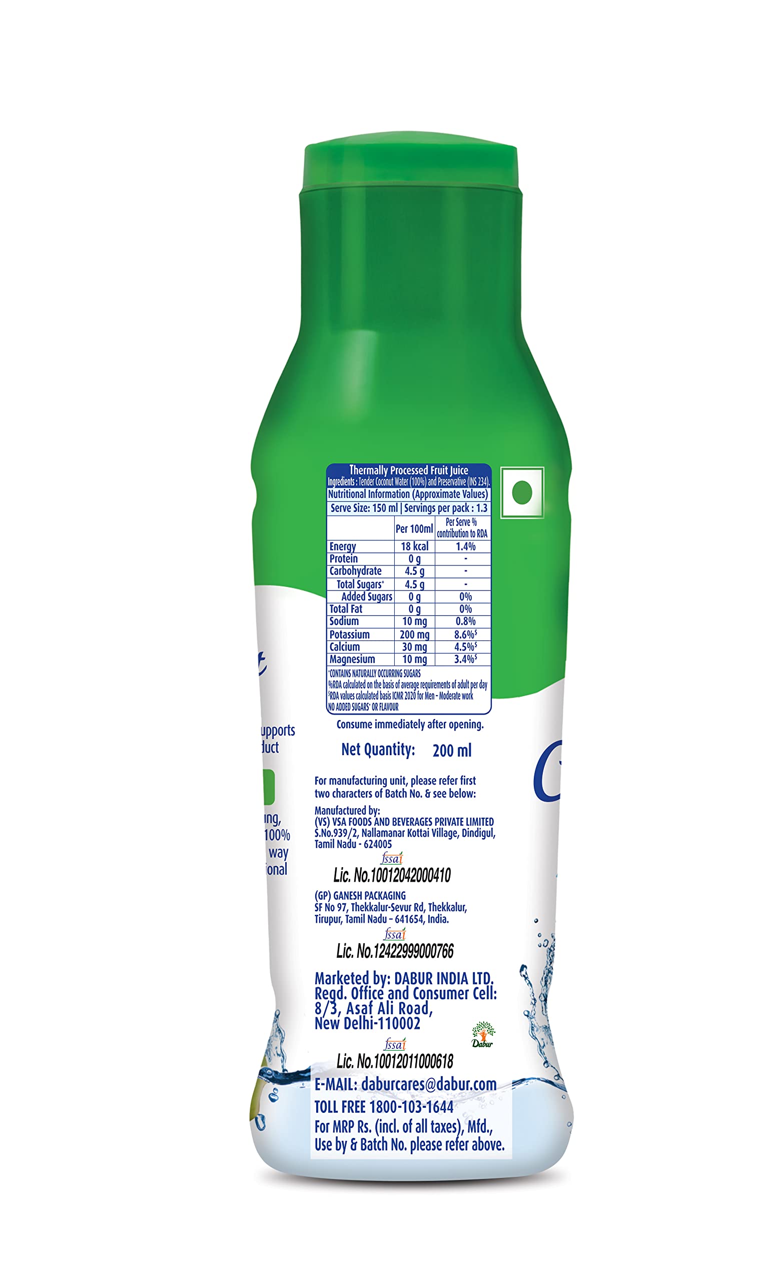DABUR Real Activ 100% Tender Coconut Water with No Added Sugars or Artifical Flavours - 200ml ( Pack of 6)