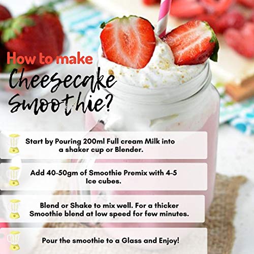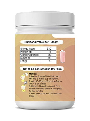 Start by Pouring 200ml Full Cream Milk into a shaker cup or Blender. Add 40-50 gm of Smoothie Premix with 4-5 ice cubes. Blend or Shake to mix well. For a thicker Smoothie blend at low speed for few month. Pour the Smoothie to a glass and enjoy.