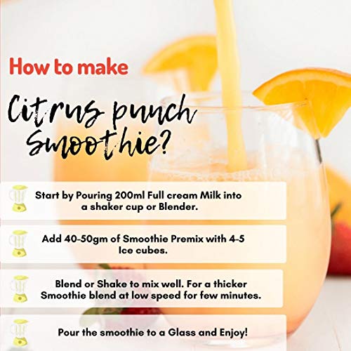Start by Pouring 200ml Full Cream Milk into a shaker cup or Blender. Add 40-50 gm of Smoothie Premix with 4-5 ice cubes. Blend or Shake to mix well. For a thicker Smoothie blend at low speed for few month. Pour the Smoothie to a glass and enjoy.