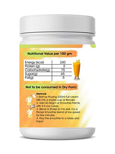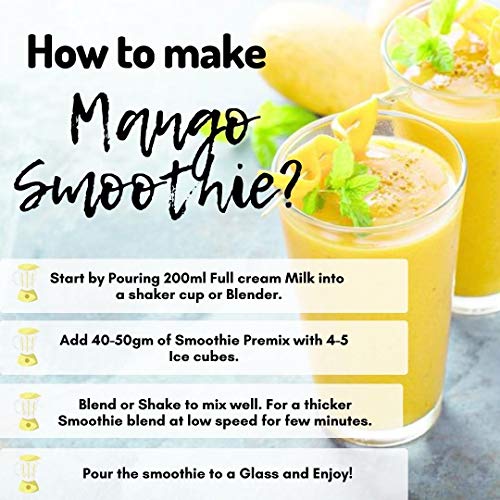 Start by Pouring 200ml Full Cream Milk into a shaker cup or Blender. Add 40-50 gm of Smoothie Premix with 4-5 ice cubes. Blend or Shake to mix well. For a thicker Smoothie blend at low speed for few month. Pour the Smoothie to a glass and enjoy.