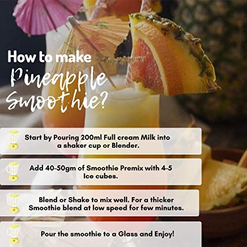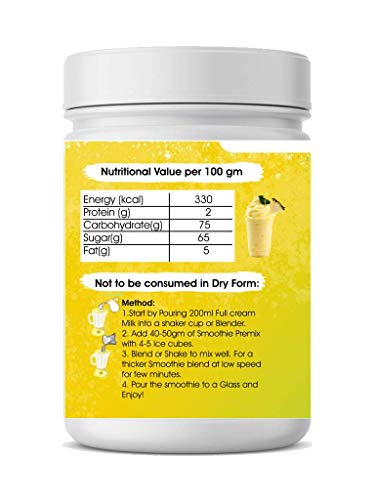 Start by Pouring 200ml Full Cream Milk into a shaker cup or Blender. Add 40-50 gm of Smoothie Premix with 4-5 ice cubes. Blend or Shake to mix well. For a thicker Smoothie blend at low speed for few month. Pour the Smoothie to a glass and enjoy.
