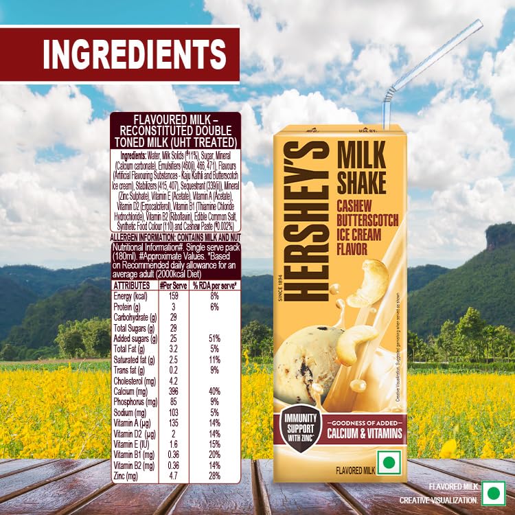 Yummy cashew butterscotch icecream flavored milkshake. Contains the goodness of calcium and vitamins along with the immunity support of Zinc. Creamy cashews come together with delectable delicious butterscotch for a yummy experience in Hershey's Cashew Butterscotch Icecream flavored milkshake.