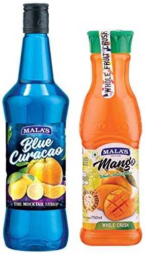 Mala's Fruit Mocktail Syrup Blue Curacao Mocktail 750mlMala's Blue Curacao when presented in a tall glass looks tempting as the tropical blue waters. Its tangy orange flavor makes it a key ingredient for many tasteful mocktail preparations best suited for lounging on a hammock blissful island living. Its deep blue colour will amaze all. A Great combo of Lime & Orange makes a perfect tangy drink.Mala's Whole Crush Mango 750 millilitreMala's Mango Crush a signature tasteful sweet and delicious taste of King of Fruit. Enjoy authentic mango flavour with enhanced aroma and flavor of the fresh ripe mangoes. Pour our bottled with love Mango crushes to make delicious Milkshakes Desserts Ice-Creams Smoothies. Use as Dessert Toppings to pour on your Sundaes. Malas's Mango crush now available all thru the year. Specification