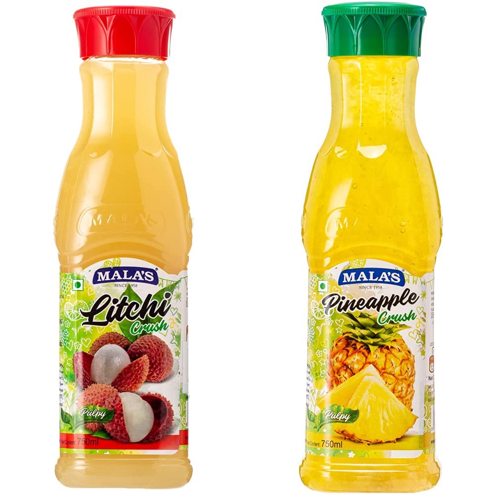 Mala's Litchi Crush Lychee 750 millilitreMalas Litchi Crush is sweet but mingles with a mild floral overtones and tiny hints of citrus when added it enhances and gives an endearingly special taste. Mala's Litchi Crush adds an Asian twist in lemonade and sodas. Add to make delicious Milkshakes Desserts Ice-Creams Smoothies. Use as Dessert Toppings to pour on your Sundaes. SpecificationMala's Crush Pineapple 750 MillilitrePineapple commands attention not just by appearance alone but also by its sweet tangy and acidic taste. Add Malas Pineapple Crush and bring the tropics to you wherever you are. Mala's Pineapple Crush brings a kick of pineapple tartness when added in Milkshakes Ice-Creams Smoothies. Use as Dessert Toppings to pour on your Sundaes and Desserts.