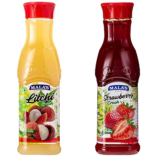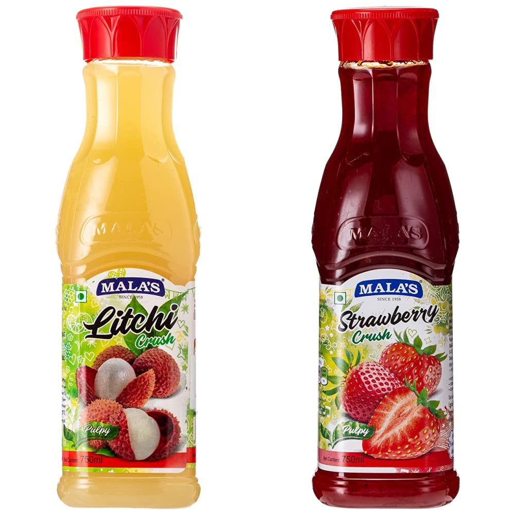 Mala's Litchi Crush Lychee 750 millilitreMalas Litchi Crush is sweet but mingles with a mild floral overtones and tiny hints of citrus when added it enhances and gives an endearingly special taste. Mala's Litchi Crush adds an Asian twist in lemonade and sodas. Add to make delicious Milkshakes Desserts Ice-Creams Smoothies. Use as Dessert Toppings to pour on your Sundaes. SpecificationMala's Strawberry Crush 750 MillilitreA summer time favourite Juicy bright happiness fruit with its deep red colour and thick pulpiness with just the right amount of sweetness you can enjoy the sensation of summer all year long with our bottled with love Mala's Strawberry Crush. Add the strawberriness to your delicious milkshakes thickshakes ice-creams smoothies. Use as Dessert Toppings to pour on your desserts and sundaes.