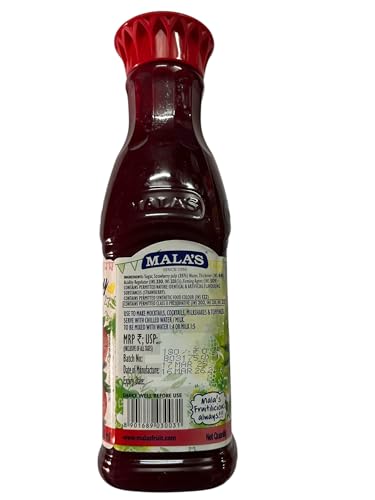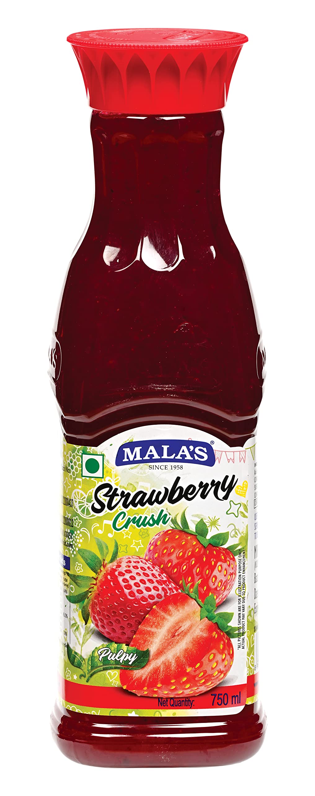 A summer time favourite Juicy bright happiness fruit with its deep red colour and thick pulpiness with just the right amount of sweetness you can enjoy the sensation of summer all year long with our bottled with love Mala's Strawberry Crush. Add the strawberriness to your delicious milkshakes thickshakes ice-creams smoothies. Use as Dessert Toppings to pour on your desserts and sundaes.