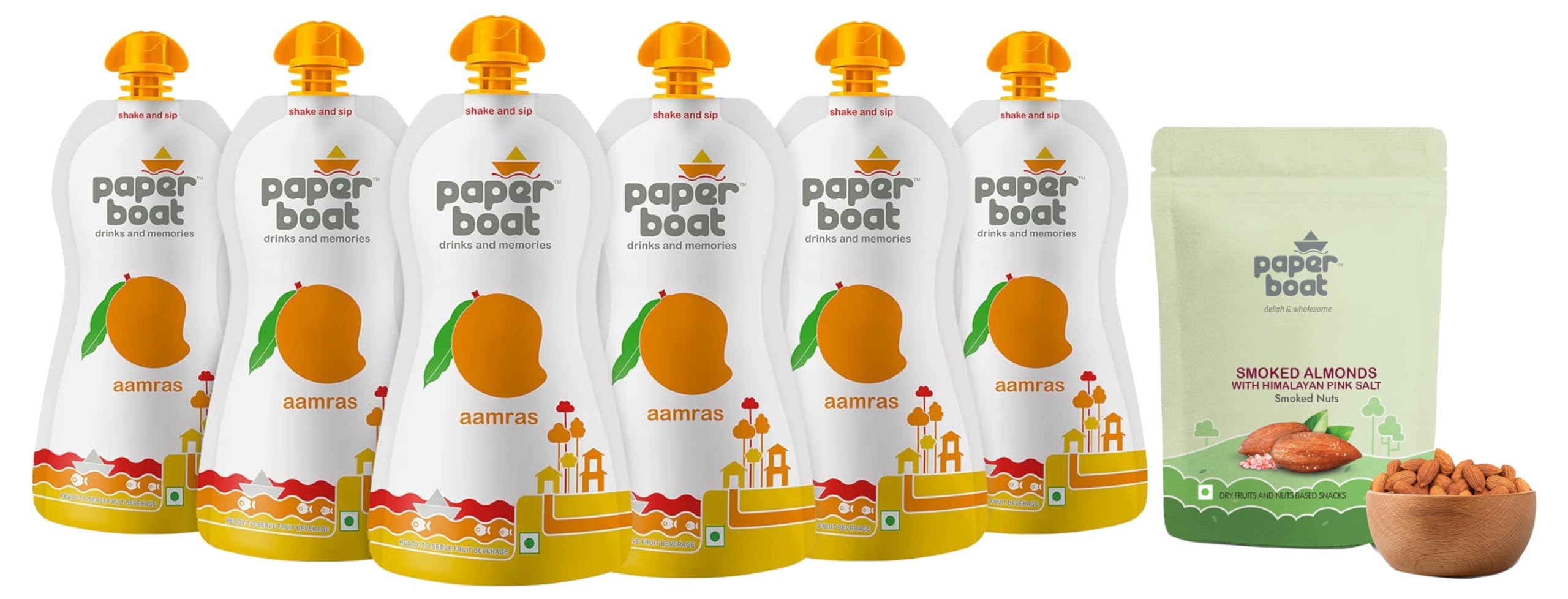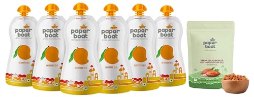 Paper Boat Premium Smoked and Roasted Almonds with Himalayan Pink Salt Healthy Dry Fruit Snack Pouch (200g)Inspired by the traditions of Indian roasting artistry this here is a product that lingers both in terms of taste and texture. Crisp crunchy almonds carefully roasted in Himalayan pink salt. With great taste comes great responsibility and so we give you almonds that have been perfectly smoked using naturally dried wood chips for that succulent flavour. From the choicest nuts to cleanest salt this is our effort to give you the best of ingredients in the most delish and wholesome way!Paper Boat Aamras Mango Fruit Juice No Added Preservatives and Colours (Pack of 6 200ml each)The one treasure that easily transforms Indian summer into a festivity that it is is Aamras. An honest treat for an honest day's work. A silkesque ale cascading down your throat - Soothing serenading and more importantly lingering. Sometimes enveloped in rotis sometimes guzzled with milk but the best way to go about fruity Aamras is to have it directly as is. The way the ancients intended. Without preservatives or artificial flavour. Without frills or hassles. Ah! One just cannot help but submit to the tasty tyranny of the one true king of the fruit realm. All hail the mango! Long live the king!