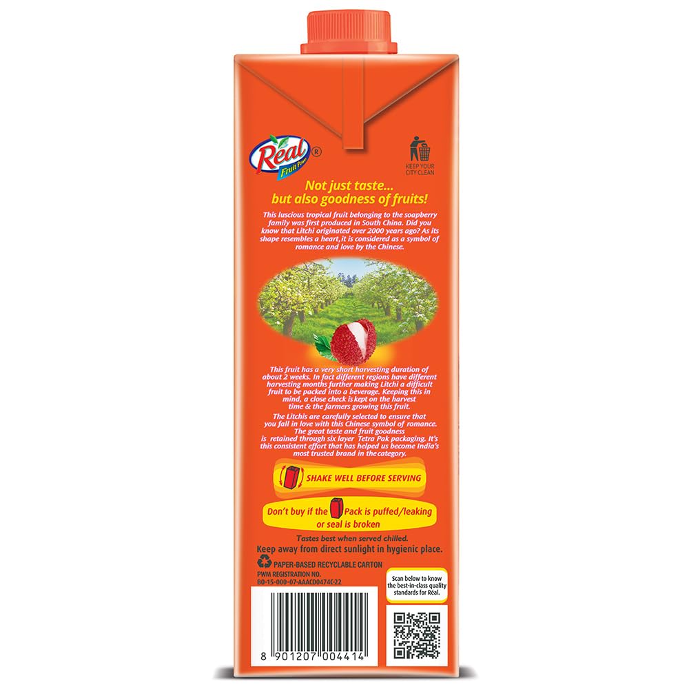 Real keep a close tab on the harvesting time to ensure that only the best litchis of the season are picked for you. Real Litchi ensures that all the benefits of litchi reach and delight you with its juicy and unique taste all year round. The Real Fruit Power Litchi offers all of the goodness of the Muzaffarpur litchis and packs it safely in a unique 6 layered Tetra Pack.