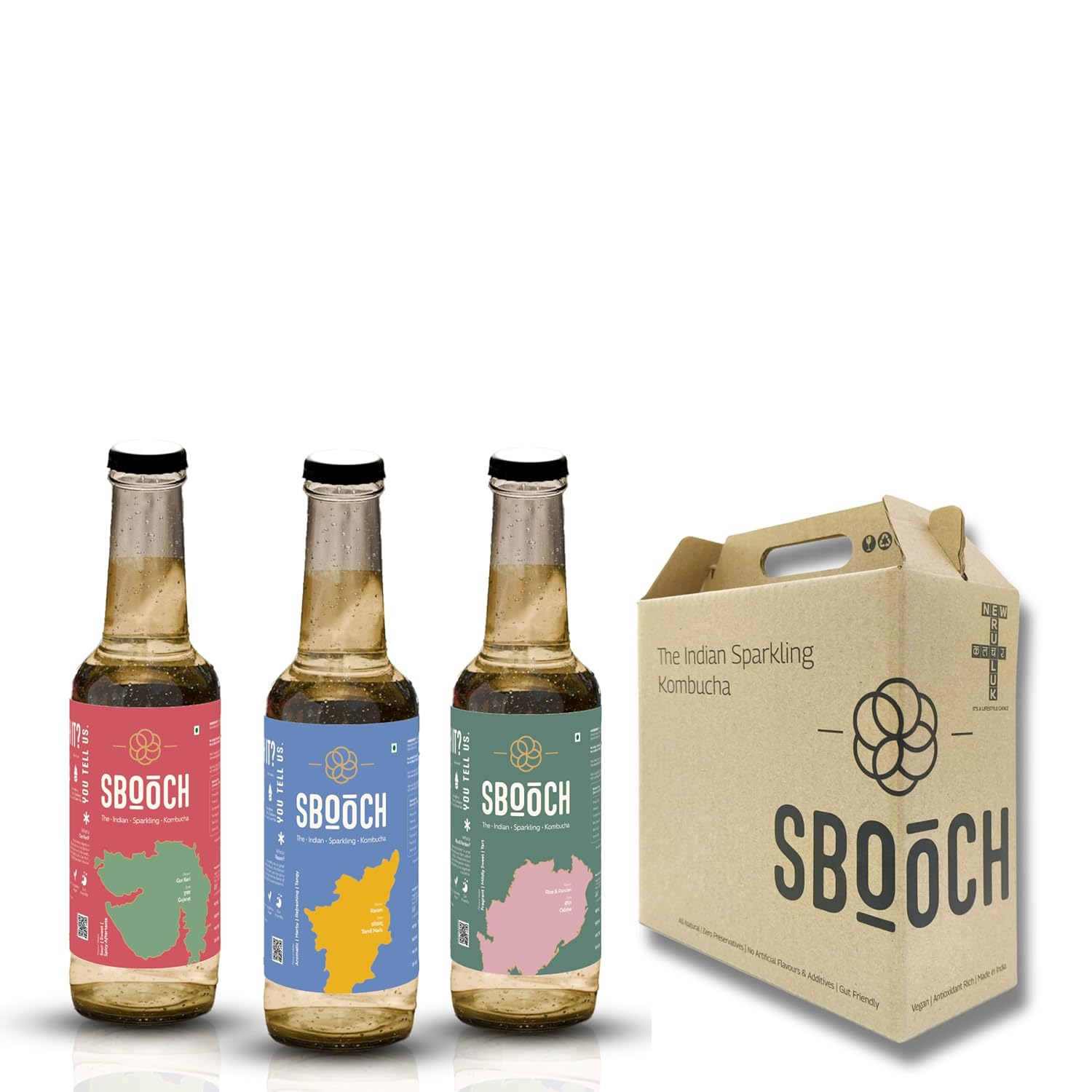 SBOOCH - Indian Sparkling Kombucha Tea | 275ml Combo of 3 Flavours | Gut-Friendly Beverage | Antioxidant-Rich Zero Preservatives | Alcohol-Free Fermented | Vegan & Gluten-Free | Natural Flavors - Rasam, Rice & Pandan, Gor Keri