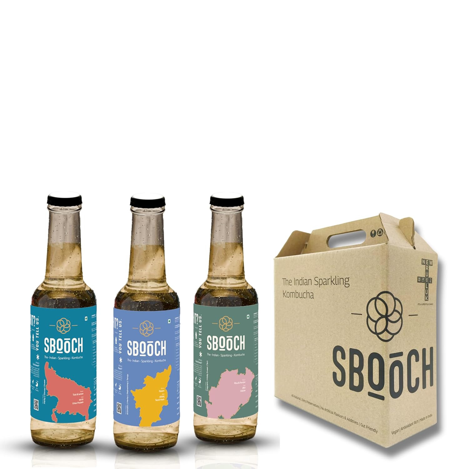 SBOOCH - Indian Sparkling Kombucha Tea | 275ml Combo of 3 Flavours | Gut-Friendly Beverage | Antioxidant-Rich Zero Preservatives | Alcohol-Free Fermented | Vegan & Gluten-Free | Natural Flavors - Rice & Pandan, Tulsi & Lemon, Rasam