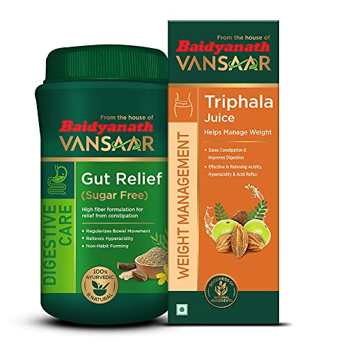 Baidyanath Vansaar Triphala Juice | Helps Weight Control | Constipation Relief | 100% Herbal Juice made with Organic Ingredients - Amla Haritaki Bahera - 1LBaidyanath Triphala Juice is a powerful combination of Amla Haritaki and Bahera. Amla is rich in Vitamin C.Baidyanath Vansaar Gut Relief | Relieves Constipation & Indigestion | Non Habit Forming 100% Safe Ayurvedic Laxative Powder to Cure Digestive Problems - 200gHigh fiber formulation for relief from constipation regularising bowel movement relief from hyperacidity. It is a sugar-free ayurvedic non-habit forming formulation made with Senna leaves ajwain Choti Harre Amaltas Mulethi & sonth