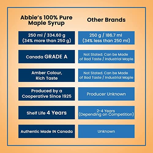 HomeGroceryBeveragesSyrups & SquashAbbie's Pure Maple Syrup, 334.6 g (250 ml - Pack of 2), Non GMO, Gluten Free, Product of Canada, Grade A,Rich Taste, Good for Pancakes, Waffles, Oatmeal, Granola, Frosting, Marinade Dressing