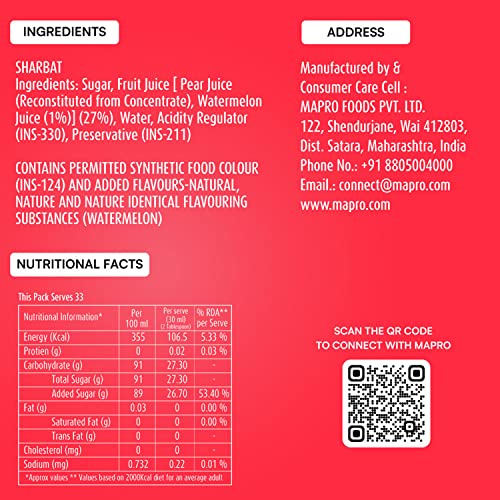 Mapro watermelon flavoured fruit syrup has a delicious sweet flavor that adds excitement to any party or beverage. When drizzled on desserts it enhances the flavour. This watermelon flavor is relished all over the world. For a fresh cooling drink blend one part Mapro watermelon flavoured fruit syrup with five parts water or soda.