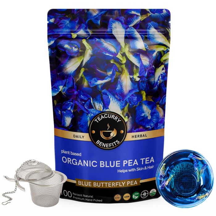 Teacurry Organic Blue Pea Tea is a refreshing caffeine-free herbal tea made from high-quality organic butterfly pea flowers. These flowers are handpicked and carefully dried creating a colorful and wellness tea. Packed with antioxidants this tea is great for your skin helps improve hair and supports overall wellness. It a great addition to your daily wellness routine.