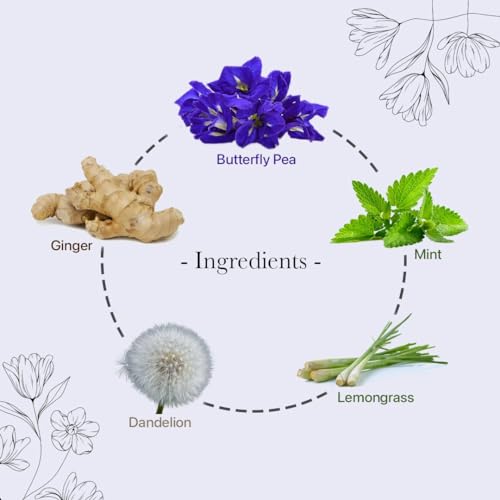 • INGREDIENTS- Powerful herbal blend our butterfly pea dandelion lemongrass ginger and mint belly tea is a carefully crafted blend of natural ingredients known for their digestive benefits. Experience the power of this herbal infusion to support a healthy b