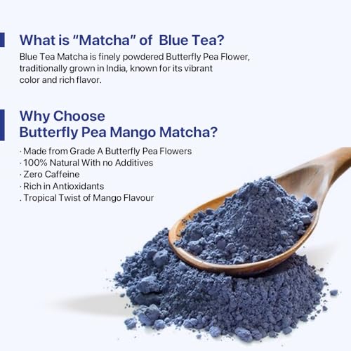 BLUE TEA - Blue Mango Matcha Powder - 50g | FRUITY DELIGHT | Anti-Oxidant Rich - Caffeine Free | Flower Based - Herbal Tea - All Natural Ingredients - Non GMO | Featured In Shark Tank | Premium Tin Packaging
