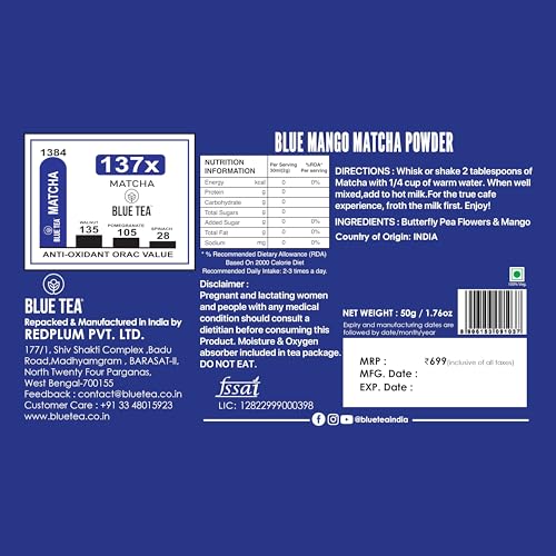 • FRUITY DELIGHTS: Introducing our Blue Mango Matcha a delightful fusion of vibrant blue hues and tropical mango flavor presented in a 50gm gifting package. This matcha blend offers a unique and invigorating tea experience that will tantalize your taste bud