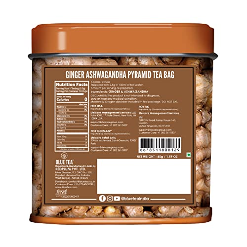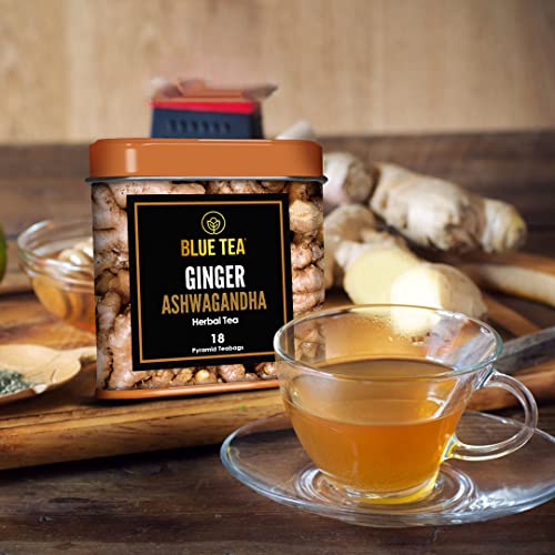 BLUE TEA - Ginger Ashwagandha Tea - 18 Tea Bags - Plant Based,AYURVEDIC BLEND,Anti-Oxidant - Caffeine-Free - Non-GMO - Gluten Free - 100% Natural | Featured In Shark Tank | Tin Pack