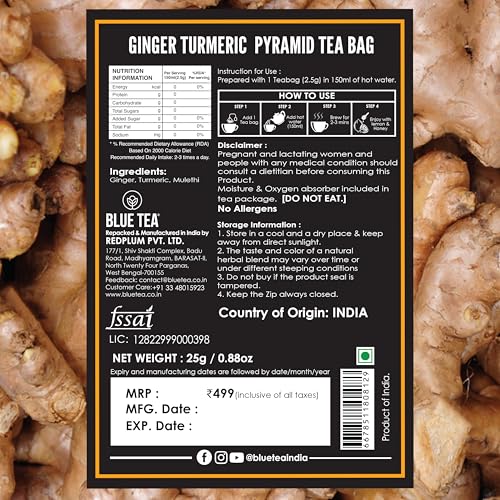BLUE TEA Ginger or (Zingiber officinale) a native of India and China is used as a spice and also in flavoring food and medicine. Turmeric or Curcuma Longa native to southern India and Indonesia has been used from antiquity as a condiment a textile dye and medically as an aromatic stimulant.
