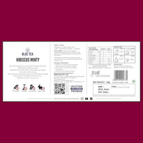 BLUE TEA - Hibiscus Tea - Gift Box - Minty Herbal Tea - 10 Tea Bags | WELLNESS PACK | Tangy Flavour - Vitamin C Rich - Gluten Free - Caffeine - Free - Flower Based | Featured In Shark Tank | Gift Hamper