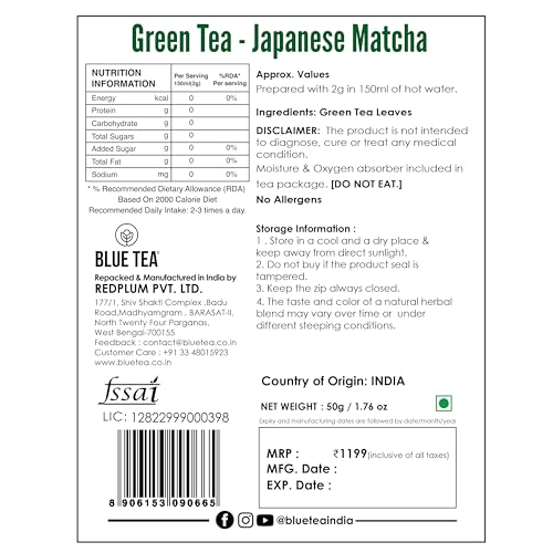 BLUE TEA - Japanese Matcha Green Tea Powder - 50g-50 Cups || GIFTING DELIGHT || Ceremonial Grade - Flavorful Fusion | Non-GMO - Gluten Free | Featured In Shark Tank | Tin Packaging