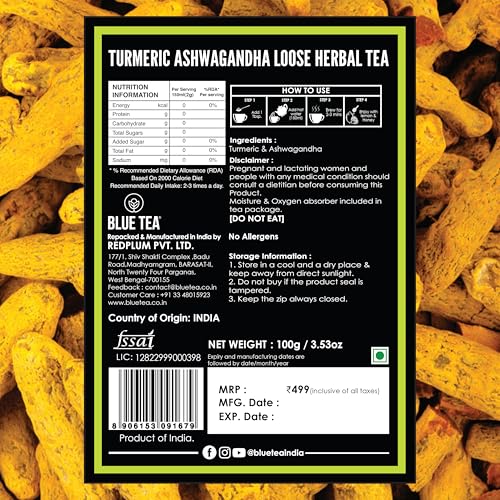 BLUE TEA Made with 100% natural Turmeric roots Ashwagandha roots and Stevia Leaves. Turmeric or Curcuma Longa native to southern India and Indonesia has been used from antiquity as a condiment a textile dye and medically as an aromatic stimulant. Ashwagandha also known as Withania somnifera helps to improve the body's immune system guarding the body against many illnesses.