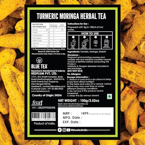 BLUE TEA Made with 100% natural Turmeric roots Moringa and Stevia Leaves. Turmeric or Curcuma Longa native to southern India and Indonesia has been used from antiquity as a condiment a textile dye and medically as an aromatic stimulant. Moringa has been used for centuries due to its medicinal properties and health benefits. It also has antifungal antiviral antidepressant and anti-inflammatory properties.