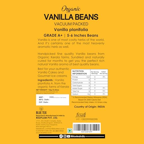 BLUE TEA - Vanilla Beans (Kerala Organic Farms) 3 Pods (12-15 grams) | Vacuum Sealed | Prime Gourmet Grade A 5~6 For Baking Extract Coffee Brewing Cooking | Featured In Shark Tank | Vacuum Pack