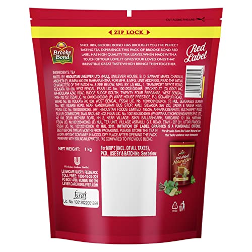 Brooke Bond Red Label is one of India's largest selling packaged tea brands. Brooke Bond Red Label Tea is a blend CTC tea with best quality leaves; processed in the unique Brooke Bond Tea Excellence Centre .Since 1869 Brooke Bond has brought you the perfect tasting tea experience with the best-chosen leaves. It was in 1903 that Brooke Bond launched Red Label. That is when Brooke Bond Red Label started worked to create India's one of most favourite beverage chai. Every cup of Red Label is brewed with the best-chosen tea leaves; that ensure your tea has strength rich colour and refreshing taste. We believe our tea has the taste of togetherness that gives that perfect taste colour and irresistible aroma. Red Label is all about coming together over a warm cup of tea with everyone arounds. It is the Swad Apnepan ka (Taste of Togetherness). Brooke Bond Red Label stands for inclusiveness and making world a better place one cup at a time.. Enjoy the great tasting range from Red Label Core and Red Label Natural Care; that has a mix of 5 Ayurvedic ingredients namely Tulsi Ashwagandha Mulethi Ginger and Cardamom. Red Label Natural Care is clinically proven to enhance immunity and help you fall ill less often.