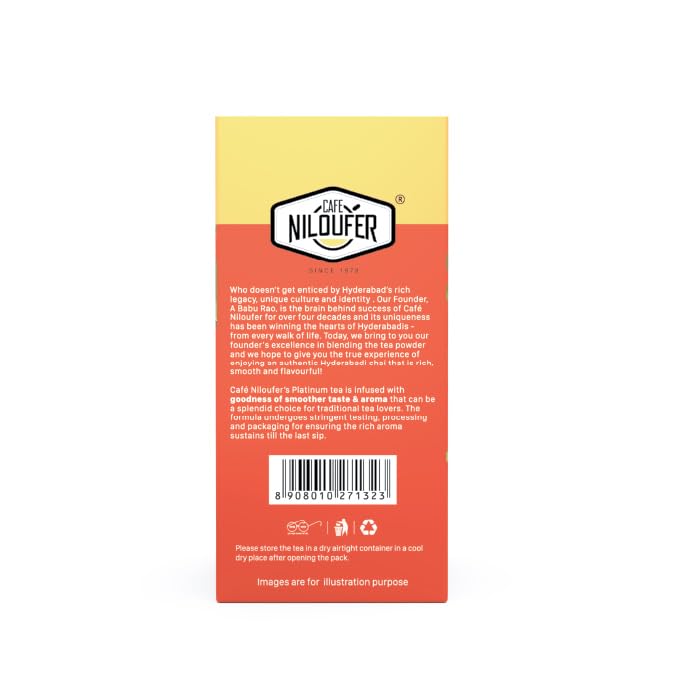 Cafe Niloufer Platinum Tea Powder Goodness Of Rich Taste: 250 gm, Enjoy the rich flavor and stimulating scent of Cafe Niloufer's Platinum Tea Powder. This premium blend, made with finely chosen CTC leaves, guarantees a delicious tea experience that will awaken your senses and revitalize your soul.About The Product:Unique and flavorful: Offers a distinct taste profile for an unforgettable tea experience.Rich aroma: A refreshing smell will awaken your senses.Uplifting: Provides a mood-boosting impact, ideal for starting the day or unwinding after a long day.Finely ground: Allows for rapid and simple brewing, making for a handy cup of tea.Ingredients:100% black CTC tea leaves.Benefits:May help boost alertness and focus: Drink a rejuvenating cup to feel energetic and ready to face the day.Promotes a sensation of peace and relaxation. Enjoy the relaxing effects of tea for a moment of peace and tranquility.Contributes to a healthy lifestyle: Tea drinking, when combined with a balanced diet and an active lifestyle, can provide a variety of health advantages.Provides necessary hydration. Stay hydrated all day with a tasty and refreshing cup of tea.warms you from within. Enjoy a soothing cup of hot tea, especially during the winter months.Directions:Step 1 teaspoon tea leaves in 1 cup of hot (but not boiling) water for 3-5 minutes.Strain your tea and enjoy it straight or with milk, sugar, or honey.About The Brand:Cafe Niloufer, a prominent tea house in Hyderabad, India, was founded in 1950 and is known for its attention to quality and distinctive tea blends. Their enthusiasm for tea-making is visible in every cup, providing a genuine and enjoyable tea experience.Cafe Niloufer Platinum Tea Powder FAQ's:1. What kind of tea is Café Niloufer Platinum Tea Powder?It is a black CTC tea, which means the leaves have been crushed, ripped, and curled to ensure speedy brewing and a robust flavor.2. Does this tea have caffeine?Yes, black tea naturally includes caffeine.3. How long can I keep Cafe Niloufer Platinum Tea Powder?To maintain freshness, store in a cool, dry area in an airtight container for up to 12 months.Legal Disclaimer: Statements regarding dietary supplements have not been evaluated by the FDA