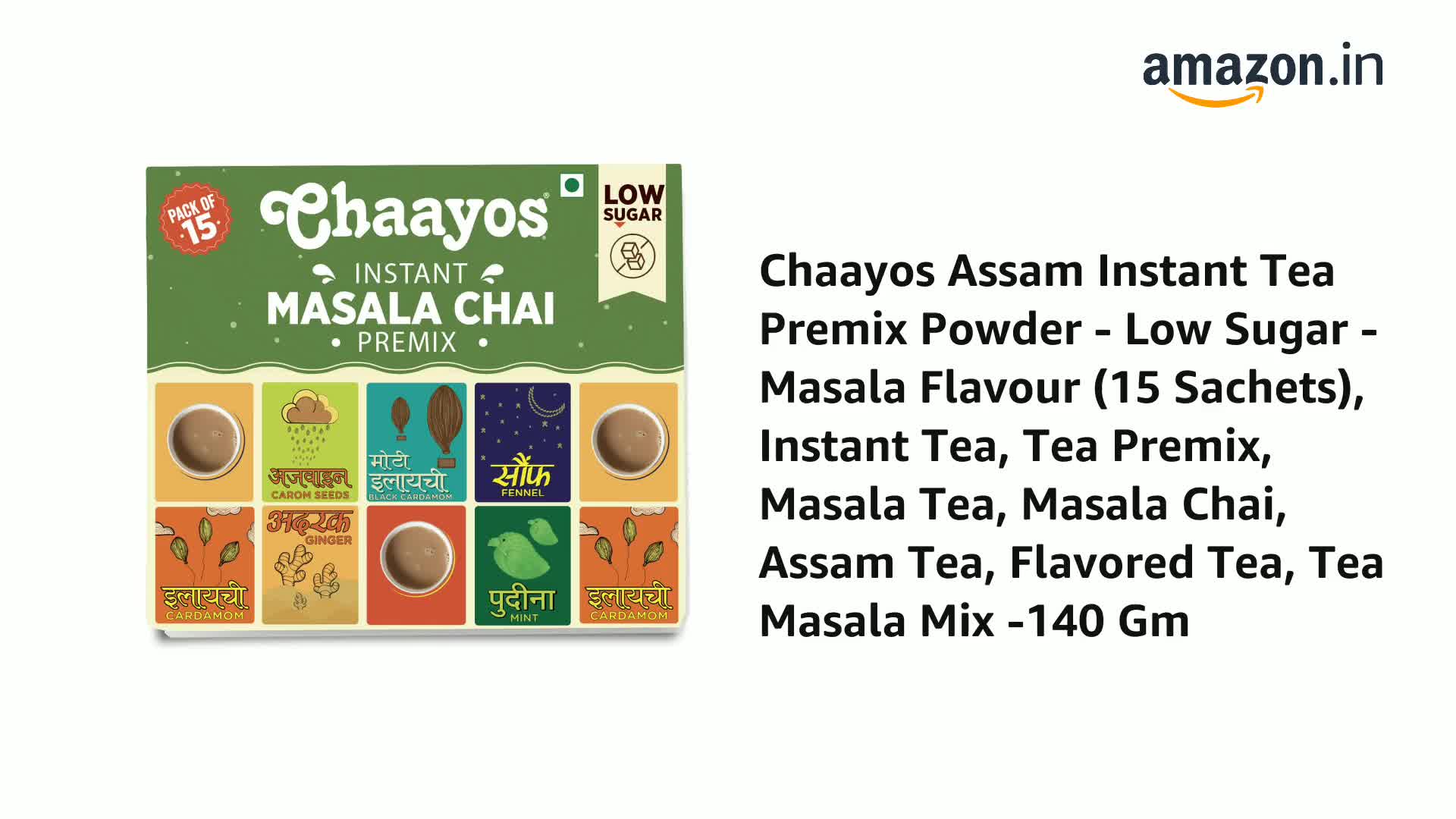 Chaayos Assam Instant Tea Premix Powder - Low Sugar Masala Flavour (15 Sachets) - Chai Flavored Assam Tea Mix - 180 Gm