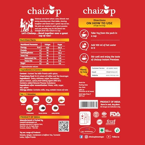 • USAGE INSTRUCTIONS : Get a hot cup of chai in less than 2 minutes! Empty the sachet contents in a cup fill it up with boiling water and stir well. Each sachet with 14gms premix makes a 100ml cup of chai.