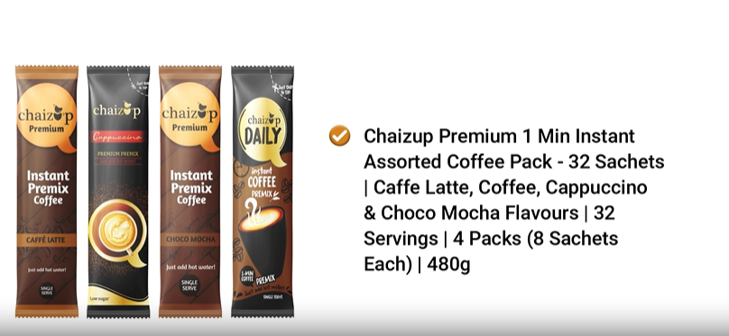 Chaizup Premium 1 Min Instant Assorted Coffee Pack - 32 Sachets | Caffe Latte Coffee Cappuccino & Choco Mocha Flavours | 32 Servings | 4 Packs (8 Sachets Each) | 480g