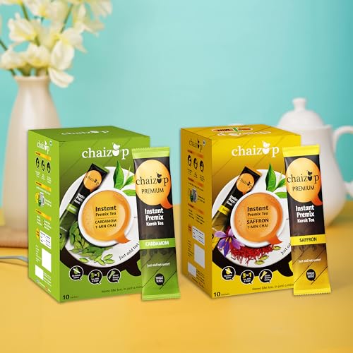 Chaizup Premium 1 Min Instant Assorted Tea Pack - 20 Sachets | Cardamom & Saffron Flavours | 20 Servings | 2 Packs (10 Flavours Each) | 280g