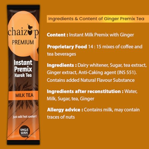 USAGE INSTRUCTIONS : Get a hot cup of chai in less than 2 minutes! Empty the sachet contents in a cup fill it up with boiling water and stir well. Each sachet with 14gms premix makes a 100ml cup of chai.