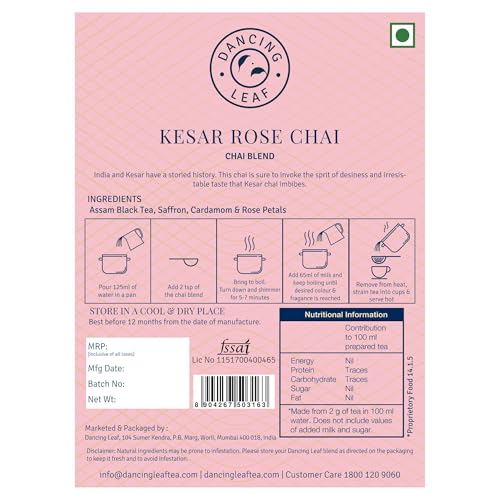 Dancing Leaf Kesar Rose Chai |Assam Black Tea, Saffron, Cardamom and Rose Petals | Premium Milk Tea | 100gms / 40cups