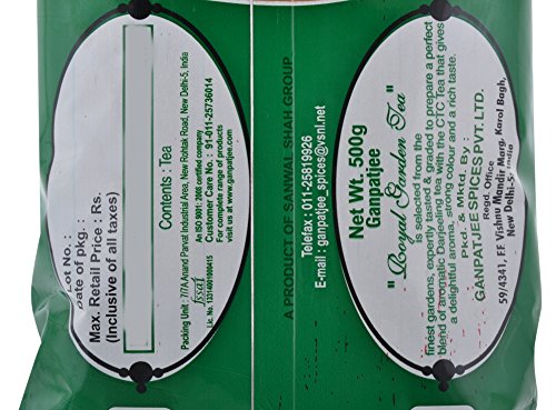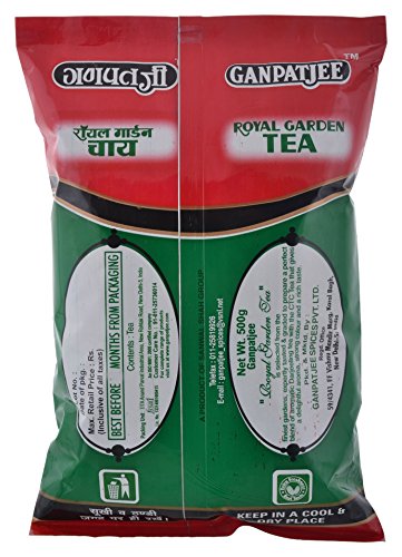 About GanpatjeeGanpatjee believes in superior quality products with the best quality ingredients packed with due care .Royal Garden Tea Masala500 gmGanpatjee Royal Garden Tea is selected from the finest gardens expertly tested and graded to prepare a perfect blend of aromatic and gives a delightful aroma strong colour and a rich taste. Keep in a cool and dry place. With a great blend of Taste and aroma. It can help relieve stress and boost immunity. contains all of nature's bounty of goodness and multiple health benefits of fine teas. This tea masala is low in caffeine and rich in antioxidants which improve metabolism and boosts immunity and energy levels invigorate the mind and body. Assists in slimming through weight loss natural detox and relieving stress. Helps prevent coughs colds and general debility. They will be the perfect addition to your pantry. It also helps to fortify the respiratory system. To keep the contents fresh and retain maximum flavour once opened transfer the contents in an airtight container or keep the contents tied and packet closed.It can help relieve stress and boost immunity. They will be the perfect addition to your pantryProduct Specifications:Product: Royal Garden Tea MasalaQuantity: 500 GramIngredients: Tea LeavesProduct FeaturesIt is good for the immune systemVegetarian Product! No Artificial colours and No additivesPackage Includes:1* Royal Garden Tea Masala 500 Gram