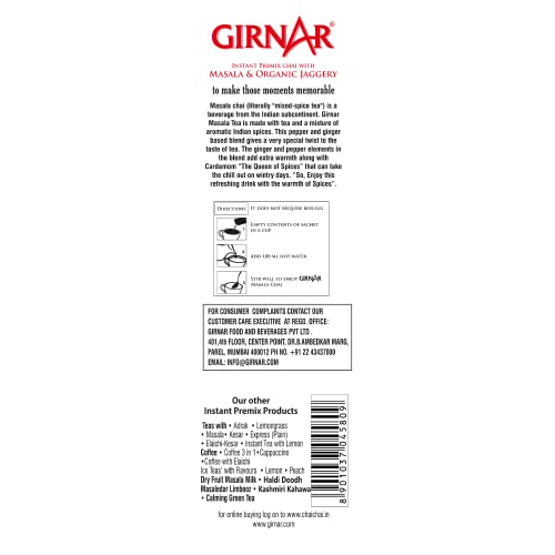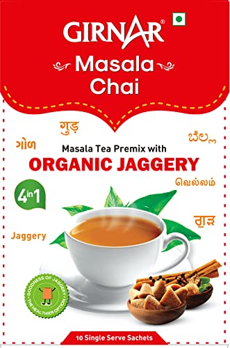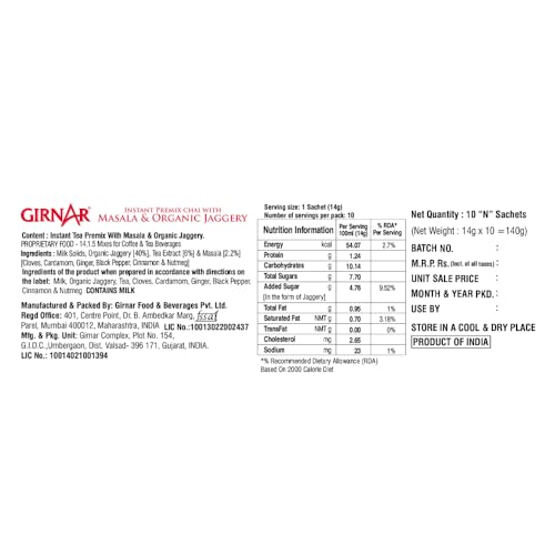 When the British introduced tea in India Desi Chai was born; When Chai was introduced in an Indian home Masala Chai was born. And when Masala Chai Premix with Organic Jaggery was introduced by Girnar Instant ghar-jaisi-chai for the sugar-conscious was born! Girnarâs Masala Chai Premix is a ready-made (pre-mixed) powder of robust Desi Chai complemented by the stimulating flavour of Cardamom Cloves Black pepper and Ginger. It finishes with the subtlety of Cinnamon and Nutmeg and mild sweetness lent by the Organic Jaggery. ~ 4 am or 4 pm In the valley or amidst the clouds Sailing or Flying Homely cuddles or solo travel: Ghar-jaisi-chai with Organic Jaggery can now be made just by adding hot water! No wonder coming back home is not necessary to feel at home. ~