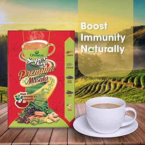 PREMIUM CHAI Discover the real goodness of 100% natural spices in each sip of Super Cup Premium Masala Tea. The very spices known for their immunity boosting benefits in Ayurveda since centuries now come together in your cup of tea. So get ready to experience cardamom clove black pepper cinnamon and ginger in one blend for strong taste and rich flavor.