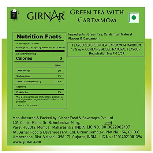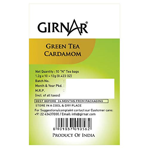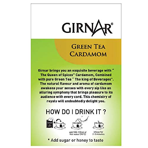 Girnar brings you an exquisite beverage with "The Queen of Spices" Cardamom Combined with Pure Green Tea "The King of Beverages". The natural flavor and aroma of Cardamom awakens your senses with every sip like an alluring symphony that brings pleasure to its audience with every cord. This chemistry of royals will undoubtedly delight you. Ingredients: Green Tea Cardamom Natural Flavor & Cardamom.