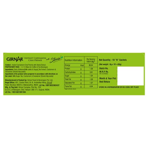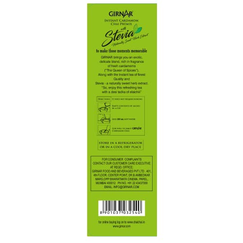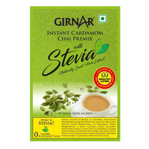 Indians boast of Chai thanks to the Queen of England; Indians boast of Cardamom Chai thanks to the Queen of Spices! From the Queen of England to the Queen of Spices (Cardamom/Elaichi) Indian Chai has been through a long journey. But you know the journey has been worthwhile when the outcome is Cardamom Chai. This is a premix of Strong chai with a delicate but refreshing Cardamom flavour and naturally sweet Stevia leaf extract. Girnarâs Cardamom Chai with Stevia is a royal blend that appeases your nose buds and your taste buds without sacrificing on that hidden sweet tooth! For those who maintain a safe distance from sugar: this Premix contains Stevia a natural leaf sweetener with a non-glycemic response. Simple pleasures just got sweeter! ~ 4 am or 4 pm In the valley or amidst the clouds Sailing or Flying Homely cuddles or solo travel: ghar-jaisi-Cardamom chai with Stevia can now be made just by adding hot water to this premix! No wonder coming back home is not necessary to feel at home. ~