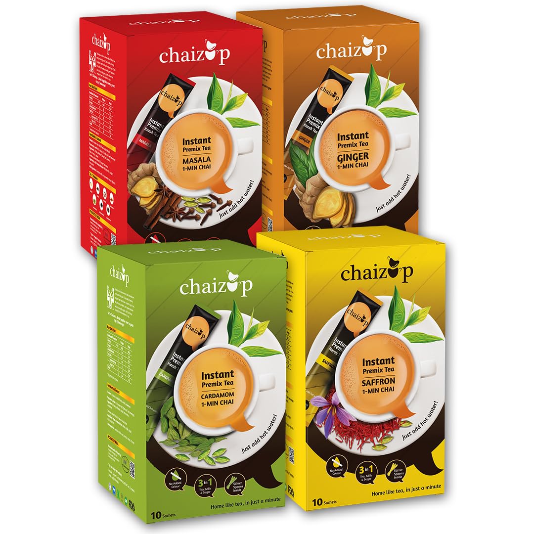 Instant Cardamom Ginger Saffron and Masala Premix Tea - Karak Ready to Drink Chai with Aromatic and Flavored Tea Masala Tea Powder Pack of 4 X 10 Sachets