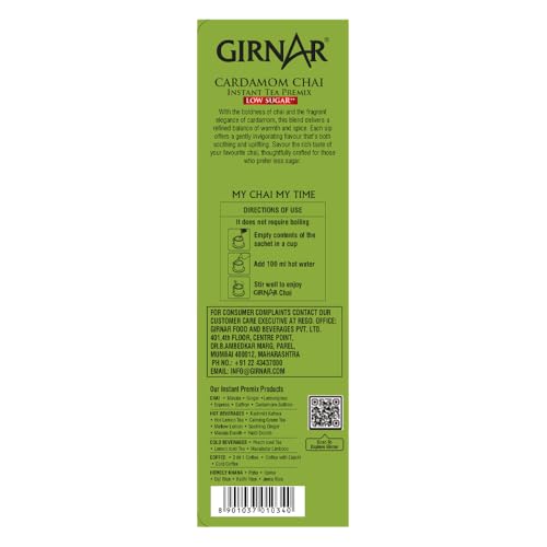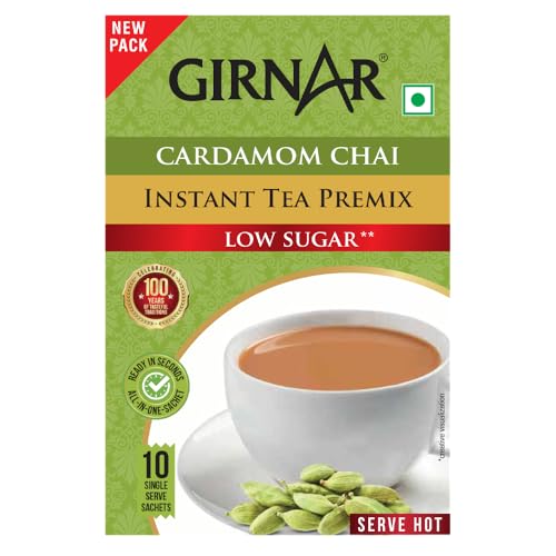 Size: 10 Sachets (Low Sugar) GIRNAR brings you an exotic delicate blend rich in fragrance of fresh cardamoms ("The Queen of Spices"). Along with the Instant tea of finest Quality. "So enjoy this refreshing tea with a desi tadka of elaichiii".