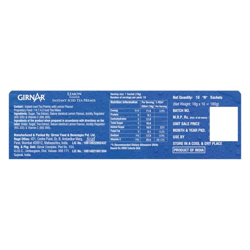 When summerâs embrace becomes too warm for your taste escape its clutches without time-waste. Girnarâs Lemon Iced Tea is the ideal fix for instant lemony-iciness.Tranquillising blend of soothing tea with a citrusy zest which helps feel cool even if you skip the ice. Leaves the palate refreshed with a sourly sweet combo. Just add cold water shake and sip.