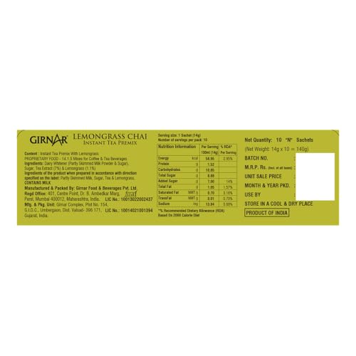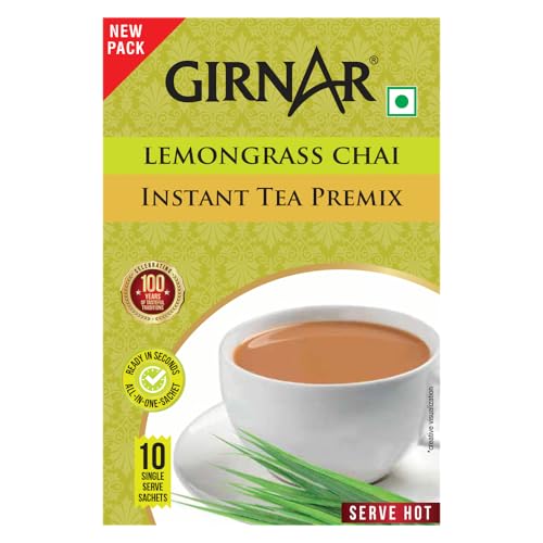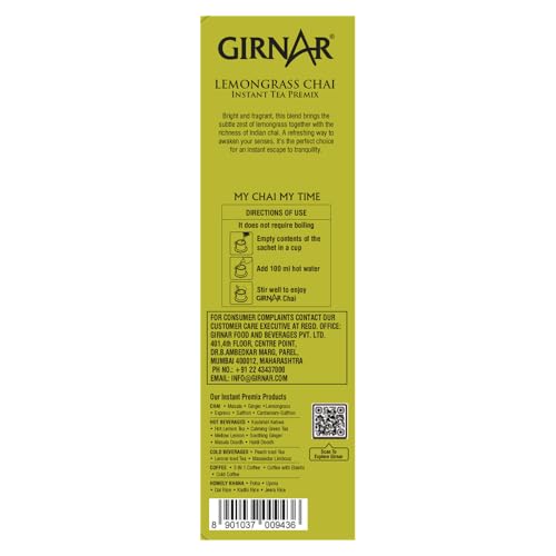 We commonly hear that most of teaâs taste is in its aroma. Add a note of Lemongrass to it and you have an olfactory delight in your cup. A native of South-East Asia Lemongrass is also called the Aromatic Healer. It is smooth and fragrant when steeped in a cup of Chai. Lemongrass confers a delicate Meyer Lemony taste a subtle dash of sweet Ginger and its trademark floral fragrance to strong Desi Chai leaving you with a smooth mouthfeel and clean finish. All this without the brewing wait. Or numerous ingredients to accumulate. Girnarâs Lemongrass Chai Premix is ready before you contemplate. 4 am or 4 pm In the valley or amidst the clouds Sailing or Flying Homely cuddles or solo travel: ghar-jaisi Lemongrass Chai can now be made just by adding hot water to this premix! No wonder coming back home is not necessary to feel at home.