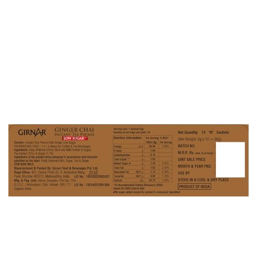 Size: 10 Sachets (Low Sugar) Ever wanted to have a tea that is both refreshing and has health benefits? Girnar's Instant Tea with Ginger contains the benefits of anti-oxidants from tea with the warming effects of ginger. Ginger (Adrak) also helps fight against infections and soothes a sore throat. A fabulous combination of tea extract and ginger makes for a perfect start to the day!.