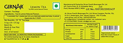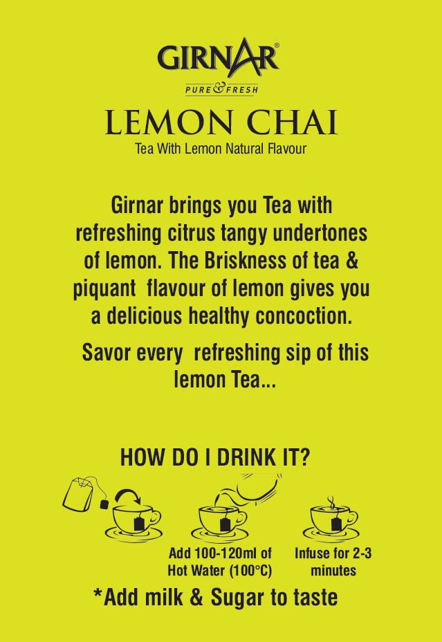 Warm up the chill on wintry days dry out the damp hugs of summery days. Girnarâs Hot Lemon Tea does the job both ways. Tranquillizing blend of soothing Black tea with a citrusy zest its flavour delights right from the aroma. Smooth on the palate with an appeasing lemony note when topped with sugar or honey it finishes with a balance of a sweetly-sour after-taste. All this without any time lag. A cup of steaming water and this tea bag. ~ Just Dip and Sip. ~