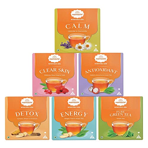 HomeGroceryBeveragesTeaNamaste Chai Herbal Green Tea Combo Pack of 6 (Antioxidant Calming Detox Energy Clear Skin Pure Herbal) Caffeine Free with Natural Herbs 16 Dip Bags Each