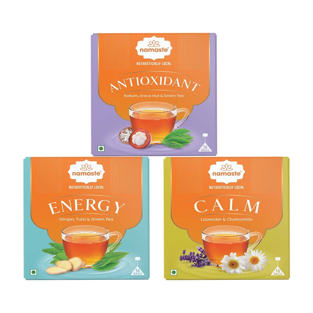 Namaste Chai Herbal Tea Combo Pack Of 3 (Antioxidant Green Tea Calming Green Tea & Energy Green Tea) 16 Dip Bags Each